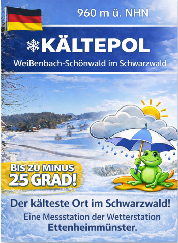 Temperatur:Bis zum 20. Dezember war es nach Angaben der Wetterstation ungewöhnlich warm im Münstertal mit Tagestemperaturen bis zu 14 Grad. Erst danach setzte sich deutlich kälteres Wetter bis zum Jahresende durch. Die Monatsmitteltemperatur betrug im gesamten Dezember 3,1 Grad und lag damit im langjährigen Durchschnittsbereich. Sehr milde Temperaturen mit mehr als zehn Grad verzeichnete die Wetterstation an zehn Tagen. Am 8. Dezember stieg die Temperatur auf 14,4 Grad in der Wetterhütte. Mild waren auch die Nächte, sie brachten bis 20. Dezember kaum Frost. Danach folgten die frostigen Weihnachtsfeiertage. Diese waren laut der Wetterstation so kalt wie seit 15 Jahren nicht mehr. Insgesamt gab es demnach zwölf Frostnächte und 17 Bodenfröste. Am frostigsten zeigte sich der Silvestermorgen mit minus 8,5 Grad in zwei Metern Messhöhe und bis zu minus 12,5 Grad am Erdboden im Dörlinbachergrund. Der letzte Tag im Jahr brachte auch gleichzeitig die kälteste Nacht im gesamten Jahr 2025.